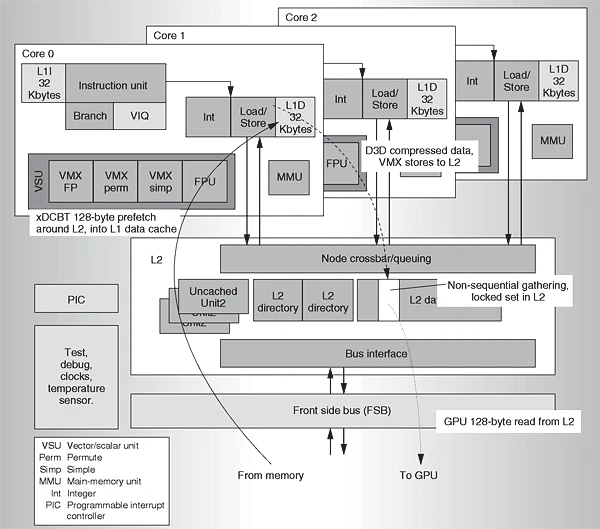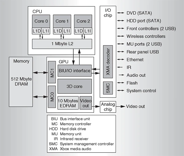 The IBM PowerPC-based Xenon CPU is a defining source of complexity. Its three cores, operating at 3.2 GHz, utilize in-order execution to prioritize power efficiency. To compensate for the potential stalls inherent in an in-order design, each core supports two simultaneous hardware threads (SMT), requiring an emulator to manage and synchronize six logical threads.